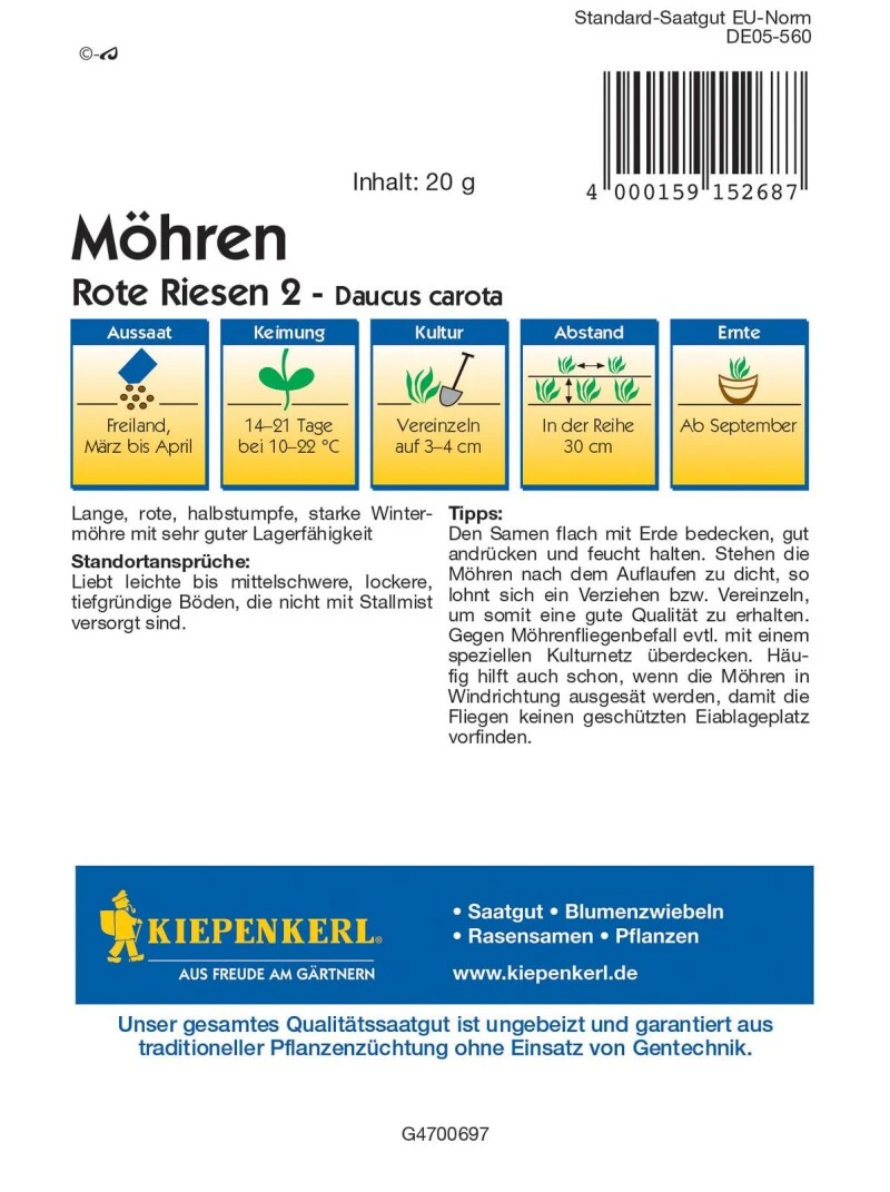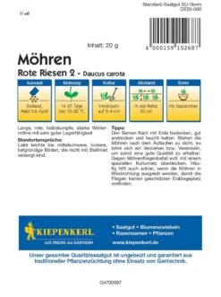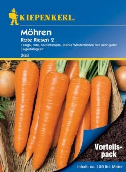 Die qualitativ hochwertigen Samen der Möhre ‚Rote Riesen 2‘ im Vorteilspack bieten besonders viel Saatgut, perfekt für große Mengen an schmackhaften Karotten aus dem eigenen Garten. Die Gemüsepflanze bildet lange, rote, halbstumpfe, starke Wurzeln, die als Wintermöhren bis in den Oktober geerntet werden können und sehr gut lagerfähig sind.