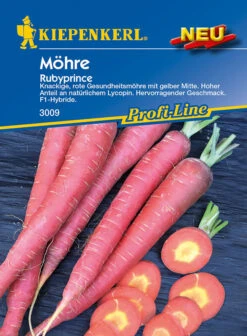 Bei der außergewöhnlichen ‚Möhre Rubyprince‘ handelt es sich um eine rote Möhre mit gelber Mitte. Dadurch ist sie wirklich ein optisches Highlight. Sie entfaltet ihr köstliches Aroma sowohl in roher als auch in gekochter Form. Durch ihren sehr hohen Gehalt an natürlichem Lycopin ist sie eine sehr süße, knackige „Gesundheitsmöhre“. Bei dieser F1-Hybride ist eine Spätaussaat von Mitte Mai bis Ende Juli möglich. Die ‚Möhre Rubyprince‘ mag einen lockeren, nährstoffreichen Boden an einem sonnigem Standort. Von September bis Oktober können Sie diese knackige Möhre ernten.