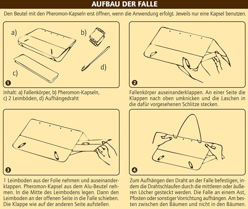 Leimboden auseinanderklappen, Pheromon-Kapsel aus dem Alu-Beutel nehmen, in die Mitte des Leimbodens legen. Dann den Leimboden in die Falle schieben, die andere Seitenklappe aufstellen und befestigen. Fallenkörper auseinanderklappen. Eine Seitenklappe aufstellen, und die Laschen in die dafür vorgesehenen Schlitze stecken. Aufhängedraht an der Falle befestigen und fertige Falle aufhängen.