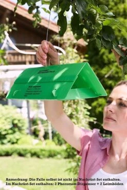 Die Falle ab Mitte Mai in Kopfhöhe an luftigem Platz neben die zu schützenden Bäume hängen. Wechseln Sie die Leimböden und Pheromon-Kapseln nach 5 bis 6 Wochen. Das Pheromon befindet sich außen auf der Kapsel. Es ist unsichtbar und geruchlos. Fallenkörper Anfang September entfernen und für nächstjährige Anwendung trocken aufbewahren. Im kommenden Jahr können Sie die Falle mit dem preiswerten Nachrüstset bestücken.