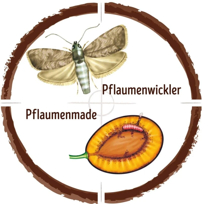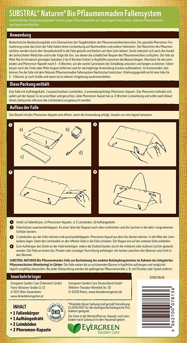 Biotechnische Falle zum Abfangen der Pflaumenwicklermännchen. Die spezielle Pheromon-Formulierung sowie das Grün der Falle haben keine Lockwirkung auf Nutzinsekten und andere Falterarten. Die Männchen des Pflaumenwicklers werden durch den Sexuallockstoff in die Falle gelockt und bleiben auf dem Leim kleben. Dadurch bleiben die Weibchen unbefruchtet und legen keine Eier ab, aus denen die schädlichen Raupen des Pflaumenwicklers schlüpfen können. Nach 5 bis 6 Wochen, Ende Juni, Anfang Juli sollen der Leimboden und die Pheromon-Kapsel gewechselt werden, um die zweite Generation des Schädlings anlocken und fangen zu können. Fallenkörper nach der Ernte oder Anfang August entfernen und für nächstjährige Anwendung trocken aufbewahren. Erfahrungsgemäß wird ein ausreichendes Abfangen der Pflaumenwicklers erreicht, wenn eine Falle für 3 bis 5 in direkter Umgebung stehende Bäume eingesetzt wird.Für die Naturen Pflaumenmaden-Falle gibt es ebenfalls im Handel ein praktisches Nachrüstset.