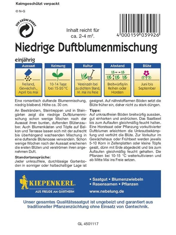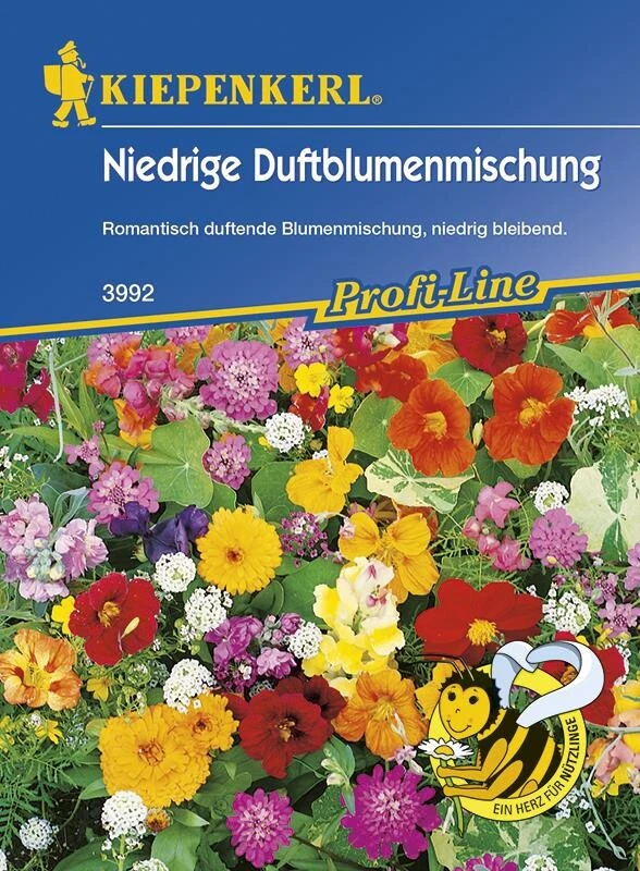 Bei der Blumenmischung „Niedrige Duftblumen“ handelt es sich um eine romantisch duftende Mischung mit Pflanzen von vergleichsweise niedrigem Wuchs. An Beeträndern, Steintreppen und in Steingärten zeigt sie schon wenige Wochen nach der Aussaat ihren bunten, duftenden Blütenzauber. Auch Blumenkästen und Töpfe auf Balkon und Terrasse lassen sich mit der aufrecht bis überhängend wachsenden Mischung aus dem Kiepenkerl Profi-Line-Programm in eine duftende Blütenoase verwandeln. Schon wenige Wochen nach der Aussaat erscheinen die ersten Blüten und verströmen ihren angenehmen Duft.