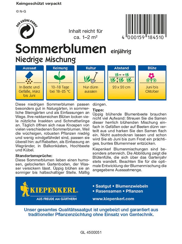 Die Blumenmischung „Niedrige Sommerblumen“ ist eine bunte Mischung blühfreudiger Beet- und Balkonblumen mit sehr langer Blütezeit. Um mit dieser Mischung üppig blühende Blumenbeete zu schaffen, ist nicht viel Aufwand nötig: Bringen Sie die Samen dieser herrlich blühenden Mischung einfach in Gefäßen oder auf Beeten dünn verteilt aus und harken Sie sie flach ein. Danach ist es wichtig, die Samen nicht austrocknen zu lassen. Schon ab Juni wird Sie bis zum Frost ein prächtiges, buntes Blumenmeer entzücken. Täglich öffnen sich neue Knospen von vielen, teils wenig bekannten Sommerblumen. Weil die wüchsigen, robusten Pflanzen niedrig und wenig windgefährdet sind, passen sie überall hin: auf Rabatten, als Einfassung an Wegrändern, in Balkonkästen und Gefäße.