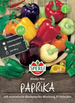 Der „Blocky Mix“ von SPERLI ist eine bunte Blockpaprika-Mischung, die sich aus der gelben Sorte ‚Coletti‘, der lila Paprika ‚Mavras‘, der roten ‚Bendigo‘ sowie der orangefarbenen Sorte ‚Milena‘ zusammensetzt. Bei allen Sorten handelt es sich um widerstandsfähige F1-Hybriden, die sowohl im Freiland als auch in Kübeln kultiviert werden können. Die Früchte erreichen ein Gewicht von 150 bis 180 g und überzeugen mit einem süß-aromatischen Geschmack. An einem sonnigen, windgeschützten Standort gedeihen die Pflanzen prächtig und tragen im Zeitraum von Juni bis Oktober zahlreiche Früchte.