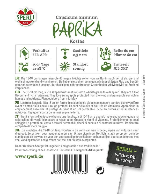 Bei der Paprika ‚Kostas‘ handelt es sich um eine Premiumsorte mit besonders wohlschmeckenden und vitaminreichen Früchten. Sie werden ca. 15 bis 18 cm lang, erinnern in ihrer Form an Eiszapfen und reifen von Weiß-Grün nach Tiefrot ab. Die Spitzpaprika liebt einen sonnigen, windgeschützten Platz und benötigt zum Aufwuchs humosen, durchlässigen und nährstoffreichen Gartenboden. Als sehr widerstandsfähige Sorte liefert ‚Kostas‘ sehr hohe Erträge im Zeitraum von Juli bis Oktober.