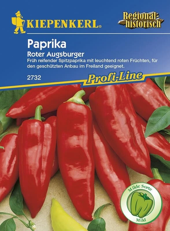 Die Paprika ‚Rote Augsburger‘ ist eine samenfeste Sorte aus dem Regional-historischen Programm sowie aus dem Profi-Line-Sortiment von Kiepenkerl. Sie eignet sich für den geschützten Anbau im sonnigen Freiland besonders gut. Die ca. 12 cm langen, spitzen Früchte reifen sehr früh von Gelb-Grün nach Rot ab, sind zuckersüß und können aufgrund ihrer dünnen Schale gut zum Trocknen verwendet werden. Wegen des hohen Ernteertrags ab Ende Juli ist eine Stützhilfe für die Pflanzen von Vorteil.