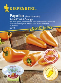 Die Snack-Paprika ‚Tribelli® Mini Orange‘ trägt kleine, knackige Früchte, die appetitlich süß und fruchtig sind. Sie haben nur wenig Samen, die sich alle im oberen Teil der Frucht befinden. Darum können Sie direkt nach dem Pflücken genascht werden. Auch für Salate, zum Füllen, Braten, Kochen und Grillen ist diese süße Naschsorte wunderbar geeignet. Die F1-Hybride aus dem Kiepenkerl Profi-Line-Programm kann in Kübeln ausgezeichnet kultiviert werden und ist von Natur aus sehr widerstandsfähig gegen den Tabakmosaikvirus.