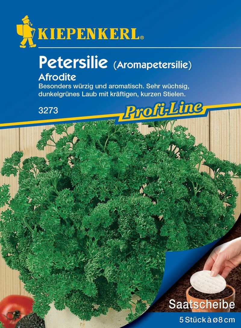 Die Petersilie ‚Afrodite‘ ist eine Aromapetersilie und besonders würzig. Die sehr wüchsige Profi-Line-Pflanze entwickelt dunkelgrünes Laub mit kräftigen, kurzen Stielen. Dank der Saatscheiben, die einfach nur in einen Topf oder Balkonkasten gelegt und angegossen werden müssen, ist nicht nur die Aussaat ein Kinderspiel, sondern auch die gesamte weitere Kultur. Ein Pikieren, Vereinzeln oder Umpflanzen ist nämlich nicht notwendig, da die Petersilienpflanzen stets im richtigen Abstand zueinander wachsen. ‚Afrodite‘ mag es ganzjährig warm und hell. Die Blätter und Stiele können etwa 12 bis 15 Wochen nach der Aussaat geerntet und in der Küche auf vielfältige Art und Weise zum Würzen und Verfeinern eingesetzt werden.