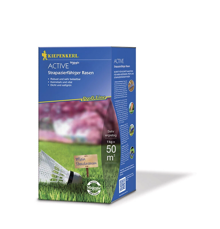 Der Kiepenkerl Profi-Line Rasen ‚Active‘ ist ein strapazierfähiger Spiel- und Sportrasen, der auch anspruchsvollen Käufern gerecht wird: Der Universalrasen ermöglicht sportliche Aktivitäten, Herumtollen und Spielen ohne schlechtes Gewissen. Durch diese Mischung erhalten Sie eine sehr belastbare, vitale und pflegeleichte Rasenfläche. Der sehr dichte Rasenteppich ergibt sich aus einer hohen Triebzahl pro m² und lädt dabei zum Aktivsein ein. Die Rasensamen dieser Strapazierrasenmischung sind sehr keimstark und bilden eine sattgrüne Fläche. Die Keimung der Rasensamen erfolgt bei guten Wetterverhältnissen bereits nach 10-14 Tagen. Ausgesät werden kann der Kiepenkerl Profi-Line Rasen ‚Active‘ auf trockenen bis halbschattigen Flächen. Die Profi-Line von Kiepenkerl ist besonders zu empfehlen, da die Qualität der Produkte unabhängig geprüft wird und mit Bestnoten ausgezeichnet wurde. Bei diesem Rasen dürfen Sie sich nicht nur über den schönen Anblick freuen, sondern die grünen Flächen auch nach Herzenslust benutzen und fordern. Die Mischung überzeugt mit einer geringen Aussaatmenge von nur 20 g/m².