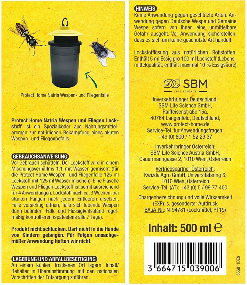 – auf den Einsatz von Insektiziden wird beim Natria Wespen und Fliegen Lockstoff verzichtet – die Falle wirkt im Gegensatz zu Wespensprays ohne Wirkstoffe.