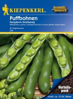 Die Puffbohne ‚Hangdown Grünkernig‘ ist eine bewährte und ertragreiche Regional-historische Sorte mit langer Tradition. Ihre kräftigen Pflanzen werden etwa 115 cm hoch und tragen viele, circa 20 cm lange, hängende Hülsen, die prall gefüllt sind. Sehr zart und besonders schmackhaft sind die mittelgroßen Körner. In frischem Zustand glänzen sie appetitlich grün, verfärben sich dann beim Trocknen und Kochen bräunlich. Diese Puffbohnen eignen sich sehr gut zum Einkochen und Einfrieren. Der Vorteilspack enthält besonders viel Saatgut für die Aussaat in Februar und März.