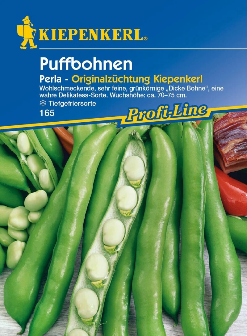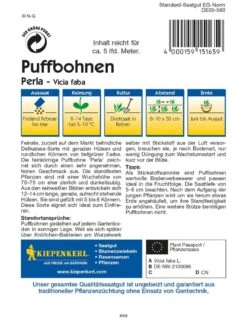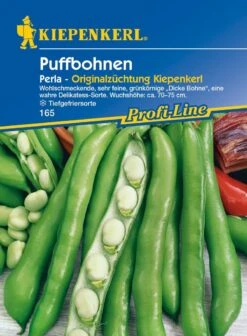 Die feinste zurzeit auf dem Markt befindliche Delikatess-Sorte ist die Puffbohne ‚Perla‘ mit geraden Hülsen und rundlichen Körnern von tiefgrüner Farbe. Diese feinkörnige Puffbohne zeichnet sich durch einen sehr angenehmen, zarten Geschmack aus. Die standfesten Pflanzen sind mit einer Wuchshöhe von 70 bis 75 cm eher zierlich und dunkellaubig. Aus den reinweißen Blüten entwickeln sich die 12 bis 14 cm langen, geraden, aufrecht stehenden Hülsen. Sie sind gefüllt mit 5 bis 6 Körnern. Diese Sorte eignet sich ideal zum Einfrieren. Eine Stütze benötigen Puffbohnen nicht. ‚Perla‘ ist eine Züchtung Kiepenkerls und Teil des Profi-Line-Programms.