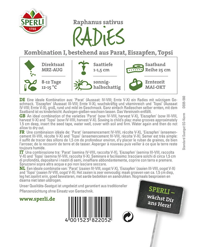 Die „Radies Kombination I“ von SPERLI enthält die drei bewährten Sorten ‚Eiszapfen‘, ‚Parat‘ und ‚Topsi‘. ‚Eiszapfen‘ ist ein 10 bis 12 cm langes, weißes Radieschen mit leicht grünem Kopf, während sich ‚Parat‘ als ein recht platzfestes Radieschen mit mittelgroßen, runden, leuchtend roten Knollen erweist. Bei der Sorte ‚Topsi‘ wiederum handelt es sich um ein ansprechend rotes, rundes Radieschen mit sehr großen Knollen. Die Samen aller drei Sorten befinden sich auf einem praktischen Saatband, was die Aussaat ungemein erleichtert.