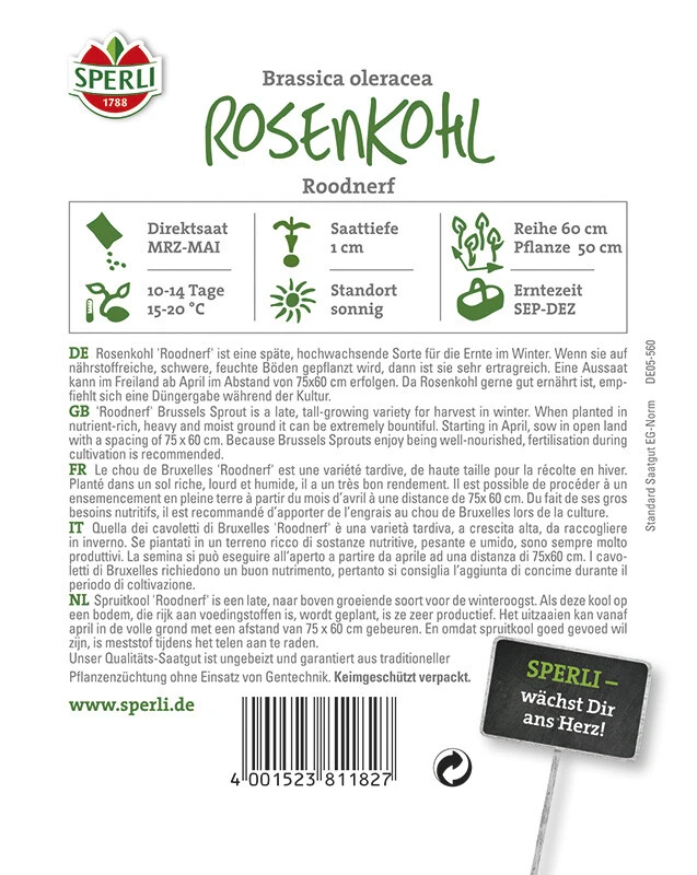 Leckerer Rosenkohl kann auch in Deinem Garten wachsen mit dem Rosenkohl ‚Roodnerf‘. Dabei handelt es sich um eine späte, hochwachsende Sorte für die Ernte im Spätherbst und Winter. Die meiste Ernte bringt sie, wenn sie auf nährstoffreichen, schweren und feuchten Böden gepflanzt wird. Ab September kannst Du die leckeren Röschen ernten. Zudem ist ein Vorteil dieser Sorte, dass Du sie einfrieren kannst. Damit lassen sich auch nach der Erntezeit köstliche Gerichte mit dem schmackhaften Rosenkohl ‚Roodnerf‘ aus dem eigenen Anbau zubereiten.