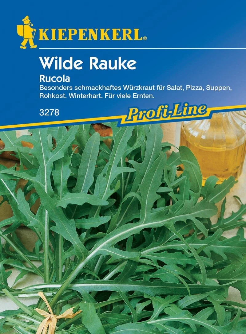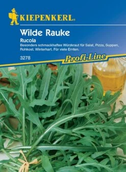 Der Rucula ‚Wilde Rauke‘ ist ein besonders schmackhaftes Würzkraut für Salat, Pizza, Suppen oder Rohkost. Innerhalb kürzester Zeit ist er aufgrund seines angenehmen, erdnussartigen Aromas zu einem beliebten Bestandteil in der italienischen Küche geworden. ‚Wilde Rauke‘ zeichnet sich durch langgezogene Blätter aus, die tief gebuchtet und kräftig grün sind. Zunächst wächst diese Profi-Line-Sorte langsam, entwickelt sich dann aber sehr üppig, sodass die Pflanzen 6 bis 7 Wochen nach der Aussaat kontinuierlich über lange Zeit abgeerntet werden können. ‚Wilde Rauke‘ fühlt sich auf jedem humosen Gartenboden in sonnigen wie halbschattigen Lagen wohl und eignet sich auch für die Kultur in Balkonkästen und größeren Gefäßen.