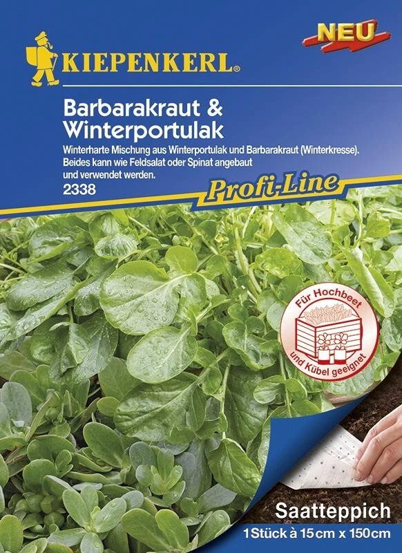 Die winterharte Profi-Line-Mischung ‚Barbarakraut und Winterportulak‘ vereint die Vorzüge zwei verschiedener Krautsorten. ‚Barbarakraut‘ ist eine würzige Winterkresse mit einem scharfen, kresseartigen Geschmack, der an Wasabi erinnert. Je trockener der Standort dieser Salatpflanze gewählt wird, desto schärfer ist ihr Geschmack. Geerntet werden können die Pflanzen mindestens bis zum 4. Dezember, dem Barbaratag, welcher der Pflanze ihren Namen verliehen hat. Der ‚Winterportulak‘ bildet hingegen fleischige, leicht zugespitzte Blätter und wird auch „Postelein“ oder „Kubaspinat“ genannt. Beide Pflanzen sind ausgesprochen gute Vitaminspender für den Winter und können ähnlich wie Feldsalat angebaut und verwendet werden. Geerntet wird die Mischung normalerweise 6-8 Wochen nach der Aussaat von Oktober bis Januar. Dank des Saatteppichs ist das Aussäen sehr schnell und einfach erledigt. Ausgezeichnet eignen sich diese Sorten auch für den Anbau in Kübeln und Hochbeeten, sodass Sie bald schon vorzüglich schmeckendes Kraut ernten können. Dieses ist auf belegten Broten, in Salaten und wenn Sie es wie Spinat zubereiten, besonders schmackhaft.