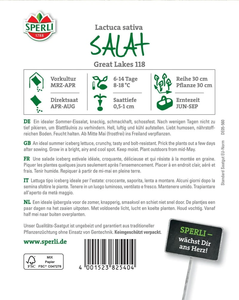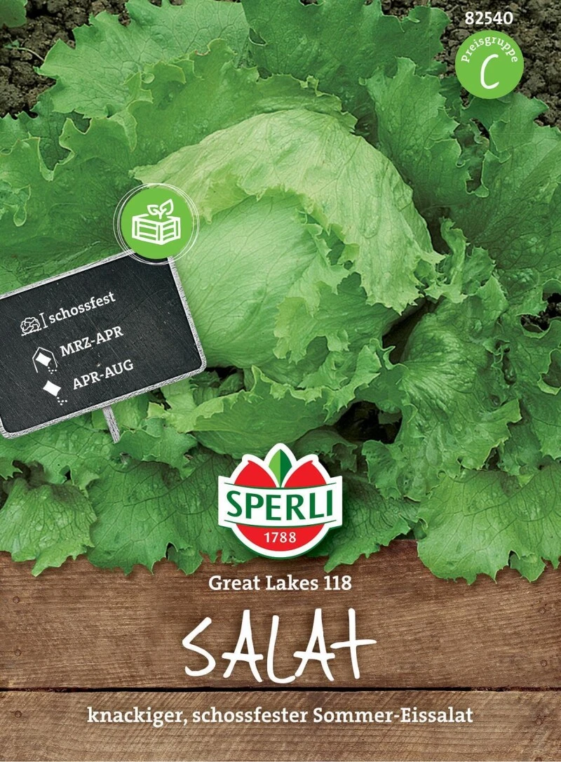 Der Salat ‚Great Lakes 118‘ ist ein schossfester Sommer-Eissalat. Er kann entweder im März und April vorkultiviert oder im Zeitraum von April bis August ins Freiland ausgesät werden. Im Falle einer Vorkultur werden die Jungpflanzen ca. Mitte Mai ins frostfreie Freiland gesetzt. Ein humoser, nährstoffreicher Boden und kontinuierliche Feuchtigkeit ist für eine gelingsichere Anzucht ideal. Je nach Aussaatzeitpunkt können die Salatpflanzen von Juni bis September geerntet werden. Die Blätter sind knackig, schmackhaft und für verschiedenste verwendbar.