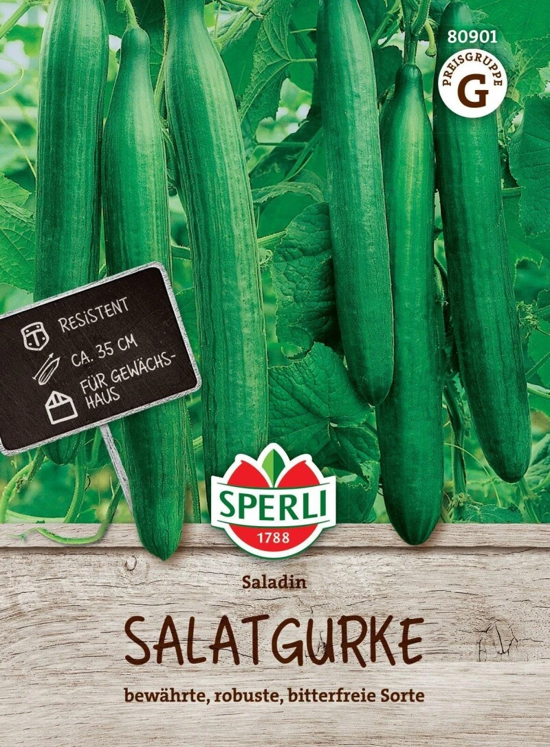 Die Salatgurke ‚Saladin‘ ist eine bewährte F1-Hybride, welche für den Gewächshausanbau ideal geeignet und gegen Gurkenkrätze resistent ist. Die Aussaat kann im März oder April erfolgen. Während der Kultur ist es wichtig, die Pflanzen an Schnüren und Gittern nach oben zu leiten und Seitentriebe aus den Blattachseln zu entfernen. Im Zeitraum von Juni bis September werden die rund 36 cm langen, bitterstofffreien Gurken erntereif. Geerntet werden sollten nur die Stammfrüchte.