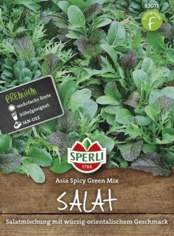 Der Salat „Asia Spicy Green Mix“ ist eine orientalische Salatmischung bestehend aus ‚Mizuna‘, ‚Green Boy‘, ‚Misome‘ und ‚Mustard Red Giant‘ mit würzigem Geschmack und Blättern in verschiedenen Farben und Formen. Sie sind geeignet für blanchiertes Gemüse und frische Salate. Durch regelmäßige Folgesaaten kann das ganze Jahr geerntet werden – auch auf dem Balkon, da die verwendeten Sorten in Kübeln und Kästen ebenfalls angebaut werden können. Stehen die Pflanzen zu dicht, müssen sie allerdings vereinzelt werden.