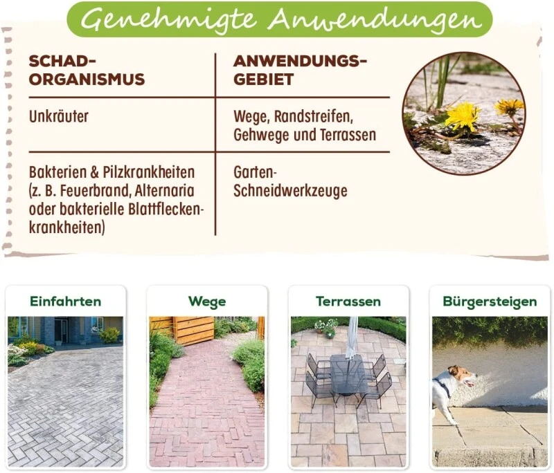 Genehmigte Anwendungen sind die Bekämpfung von Unkraut auf Wegen, Randstreifen, Bürgersteigen und Terrassen, sowie die Desinfektion von Schneidwerkzeugen zur Vermeidung von Infektionen mit