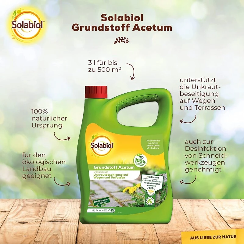 Der Solabiol Grundstoff Acetum bietet eine biologische Lösung zur Unterstützung bei der Beseitigung von Unkraut auf Nicht-Kulturflächen sowie bei der Desinfektion von Schneidwerkzeugen.