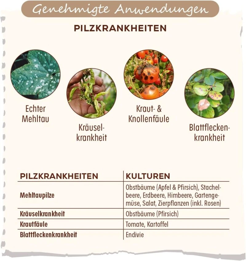 - Natürliche Pilzabwehr gegen Blattfleckenkrankheit, Echter Mehltau, Kräuselkrankheit und Krautfäule und Braunfäule an Obst, Gemüse und Zierpflanzen.