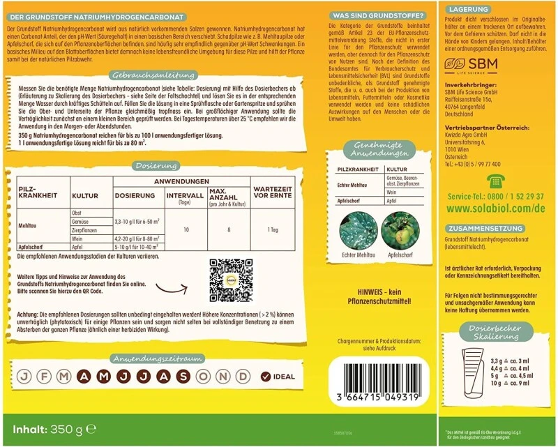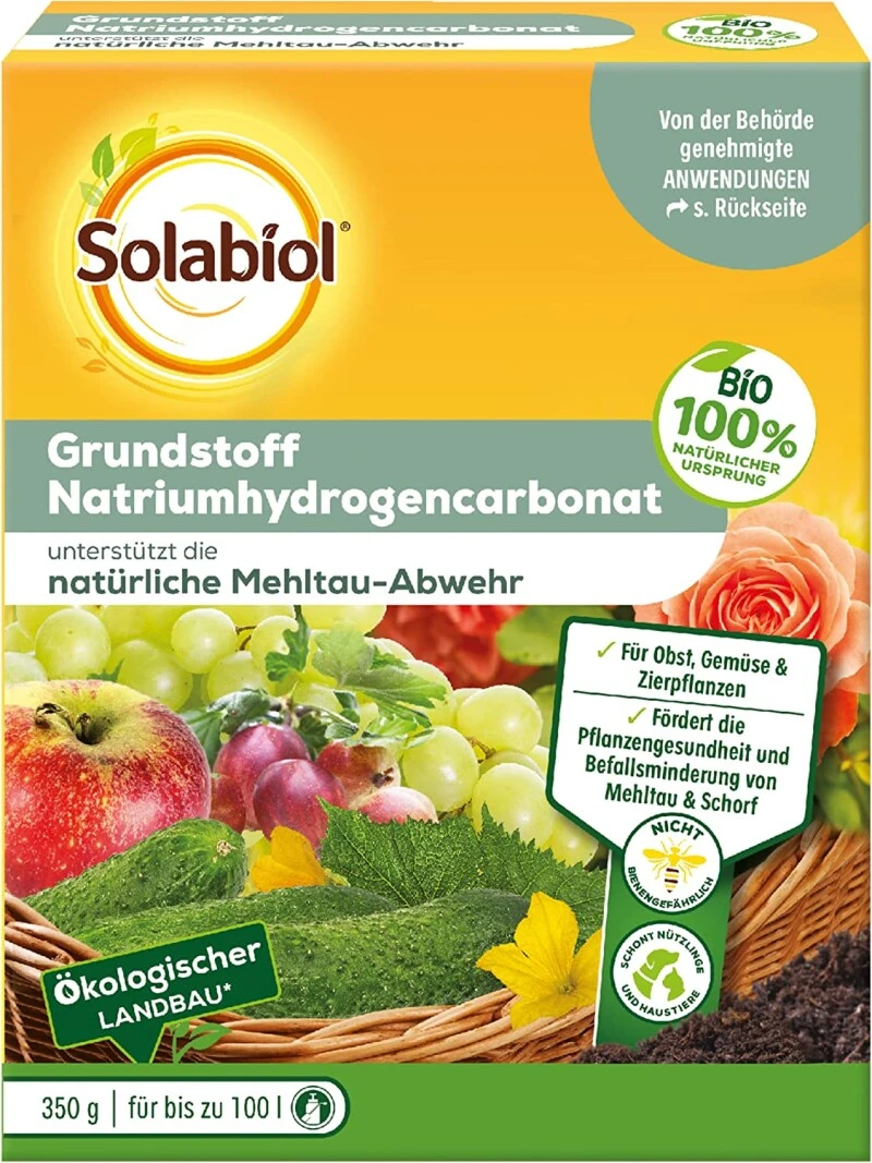 Der Solabiol Grundstoff Natriumhydrogencarbonat unterstützt die Pflanzengesundheit indem er der Pflanze bei der Pilzabwehr hilft. Genehmigte Anwendungen als Fungizid gegen Mehltaupilz (z. B. Echter Mehltau) und Apfelfschorf. Egal ob Obst,