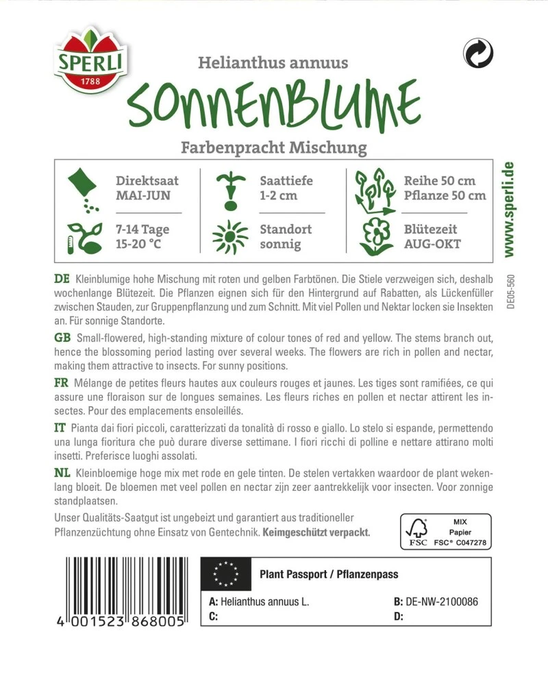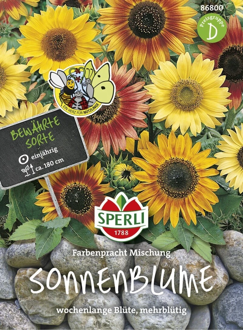 Die Farbenpracht Mischung enthält mehrstielige, kleinblumige Sonnenblumen mit verschiedenen Blütenfarben von Hellgelb bis Rotbraun. Bestens geeignet für Gruppen- und Beetbepflanzungen. Höhe: 180 cm.