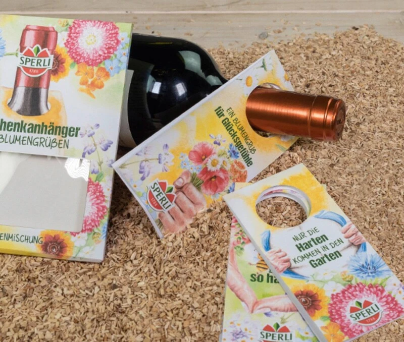 Egal, ob Wein, Kräuter- oder Dekoflasche – mit dieser Saatgut-Botschaft wird jede Flasche zum persönlichen Geschenk. Drei unterschiedliche Geschenkanhänger, drei Flaschen, drei Menschen – drei Mal Blumengrüße! Für jede Gelegenheit, denn über eine blütenreiche Blumenmischung zum Aussäen freut sich jeder. Die drei Geschenkanhänger enthalten Saatgut für jeweils 1 m² Fläche. Dieser einjährige Nützlingsmagnet begeistert Mensch und Tier. Die Samen gleichmäßig auf vorbereitetem Saatbett verteilen, einharken, andrücken und gut feucht halten.