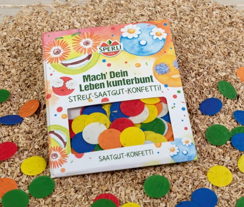 Mach‘ Dein Leben kunterbunt – streu‘ Saatgut-Konfetti! – verschenke Glücks-Konfetti zu jedem Anlass. Zuerst als Tischdekoration und dann ins Beet – einfach das Konfetti im Beet auswerfen, leicht mit Erde bedecken, wässern und zusehen, wie sich die Blütenpracht dieser einjährigen Blumenmischung aus Löwenmäulchen, Margerite, Schleifenblume und Sommerazalee entwickelt. Inhalt: 100-150 Stück rundes Konfetti aus buntem Saatpapier (Ø 2 cm). Eine Wohltat für Nützlinge und jede Menge Spaß im Leben!