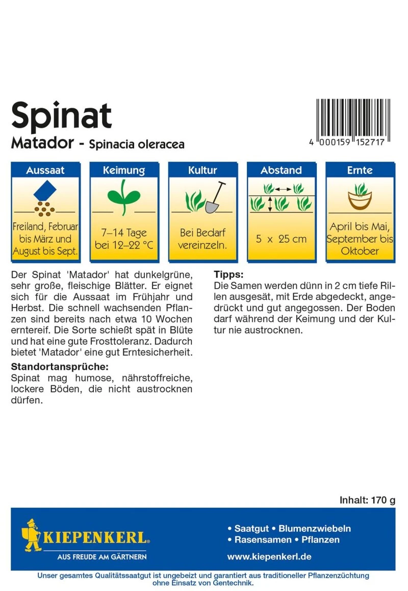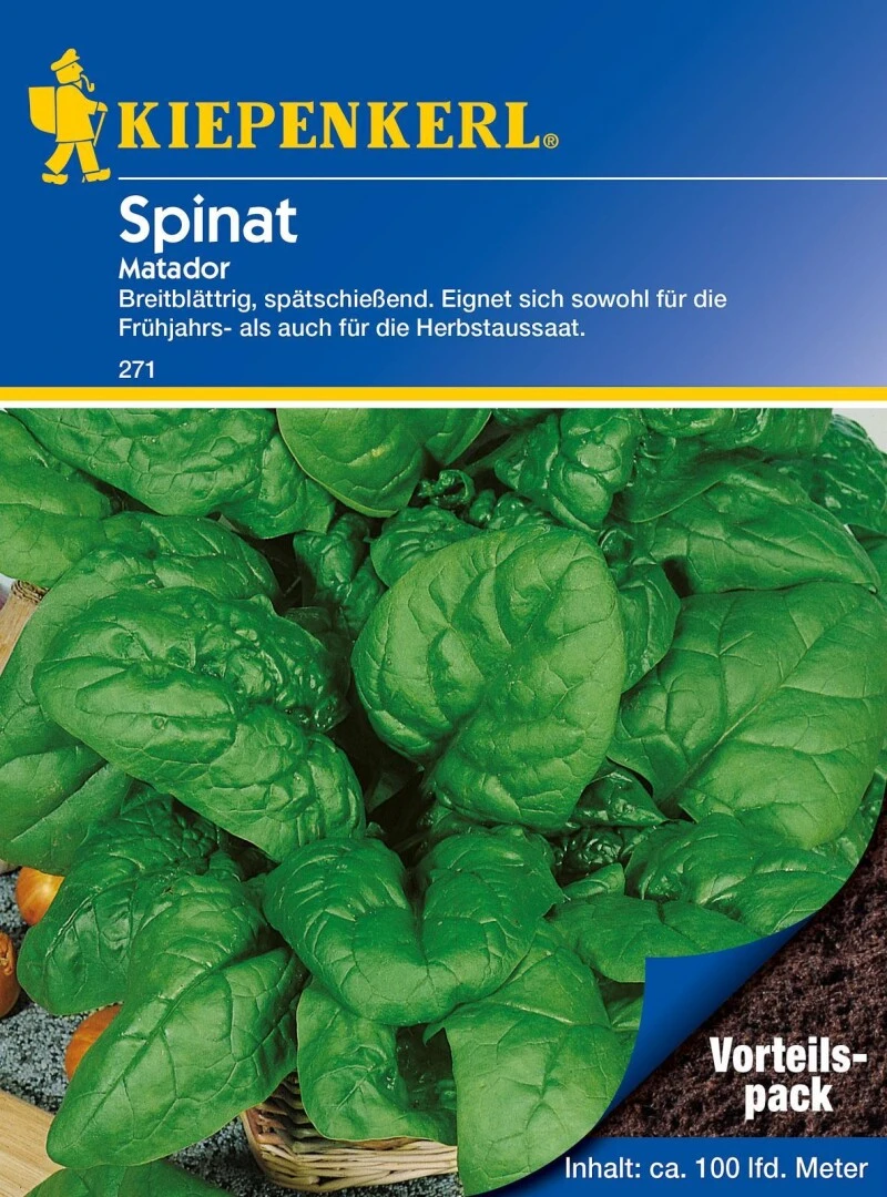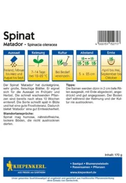Mit dem Spinat ‚Matador‘ in diesem großen Vorteilspack können Sie sich sicher sein, dass eine reiche Ernte ansteht. Diese erfolgt entweder von April bis Mai oder von September bis Oktober, denn dieser Spinat ist sowohl für die Frühjahrsaussaat als auch für die Herbstaussaat geeignet. Er ist recht winterfest, schosst spät und wächst rasch, sodass eine Ernte bereits nach 10 Wochen möglich ist. Zudem ist ‚Matador‘ auch für die frühere Kultur im Kleingewächshaus geeignet. Er hat dunkle, sehr große Blätter.