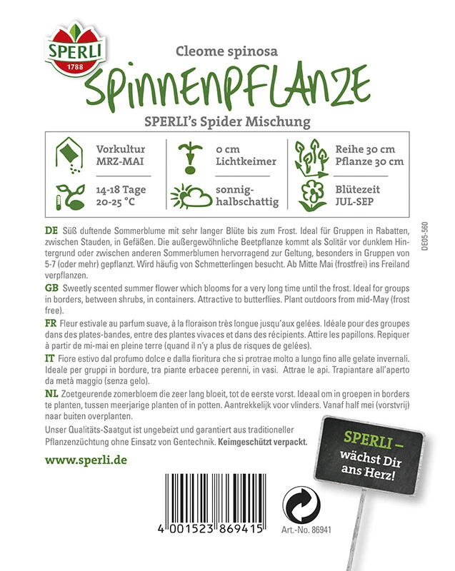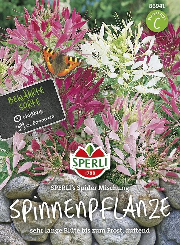 Die einjährige Spinnenpflanze – in „SPERLI’s Spider Mischung“ in verschiedenen Farbvarianten vertreten – ist eine süß duftende Sommerblume mit sehr langer Blüte bis zum Frost. Die attraktive Sommerblume erreicht eine Wuchshöhe von 80 bis 100 cm und verzückt mit auffällig gespreizten Blüten in den Farben Weiß, Rosa und Lila. Als Beet- und Gruppenpflanze oder als Sichtschutzpflanze vor Zäunen und Mauern ist sie ideal geeignet. Zudem kann sie als Solitär- oder Kübelpflanze problemlos verwendet werden. Zur Blütezeit in den Monaten von Juli bis September wird die Spinnenpflanze besonders gern von Schmetterlingen besucht.