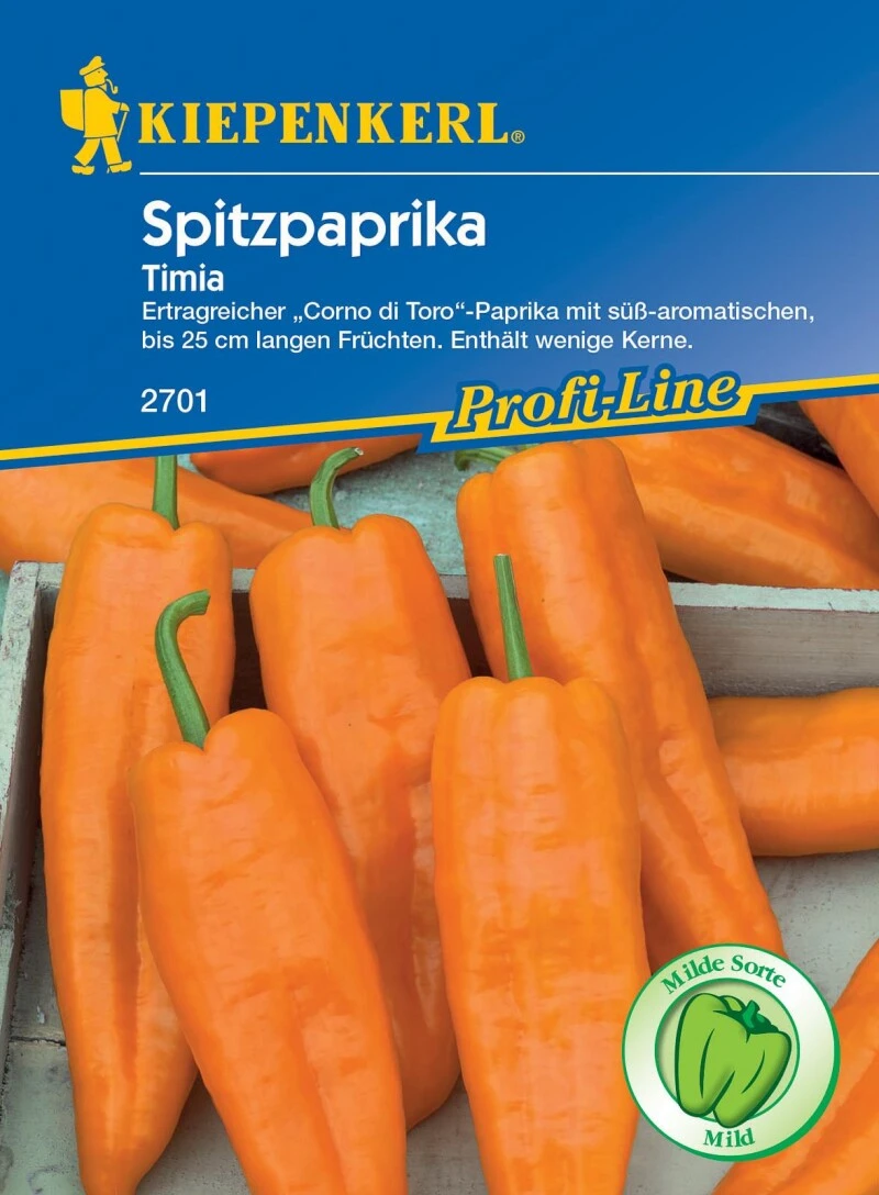 Bei der Spitzpaprika ‚Timia‘ handelt es sich um eine ertragreiche „Corno di Toro“-Paprika aus dem Kiepenkerl Profi-Line-Programm mit länglich-spitzen, bis zu 25 cm langen Früchten. Diese enthalten nur wenige Kerne und begeistern mit ihrem mildem, sehr süßem Aroma. Während des Reifeprozesses färben sich die Früchte von Grün zu einem kräftigen Orange. Für den Anbau empfiehlt sich ein Gewächshaus oder ein geschützter, sonniger Platz im Freiland. ‚Timia‘ wächst sehr robust und trägt im Zeitraum von Juli bis September viele Früchte.