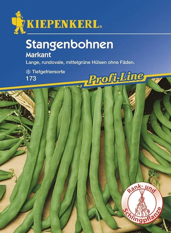 Eine sehr ertragreiche Sorte für den Treibhaus- und Freilandanbau ist die Stangenbohne ‚Markant‘. Sie bringt schöne, etwa 25 cm lange, gerade und ovale Hülsen hervor. Sie sind in attraktivem Mittelgrün, weißkörnig und bleiben lange zart. Zudem sind sie sehr gut zum Einfrieren geeignet. Die Rank- und Schlingpflanze ist tolerant gegen gewisse Viruskrankheiten und ermöglicht damit einen sorgenfreien Anbau. ‚Markant‘ gehört zum Profi-Line-Sortiment von Kiepenkerl.
