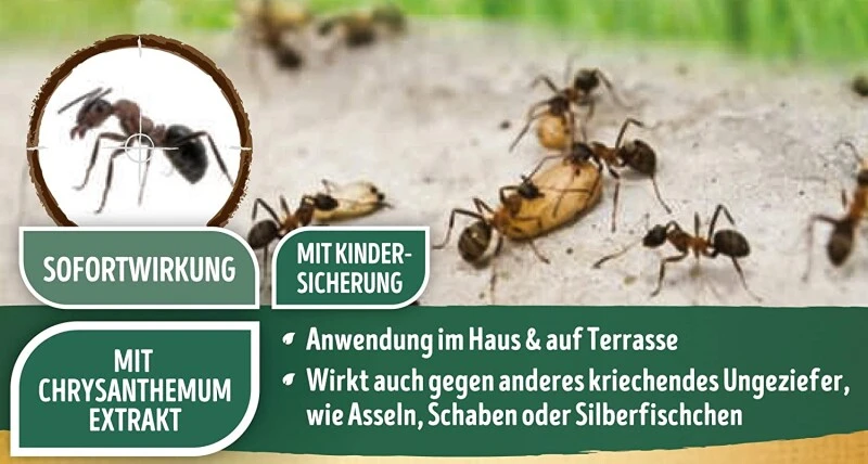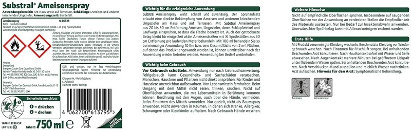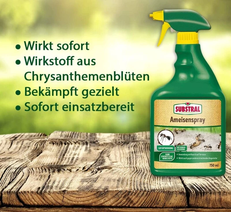 - Substral Ameisenspray aus 20 bis 30 cm Entfernung Ameisen, Ungeziefer, deren Schlupfwinkel und Laufwege leicht einsprühen, so dass die Fläche benetzt