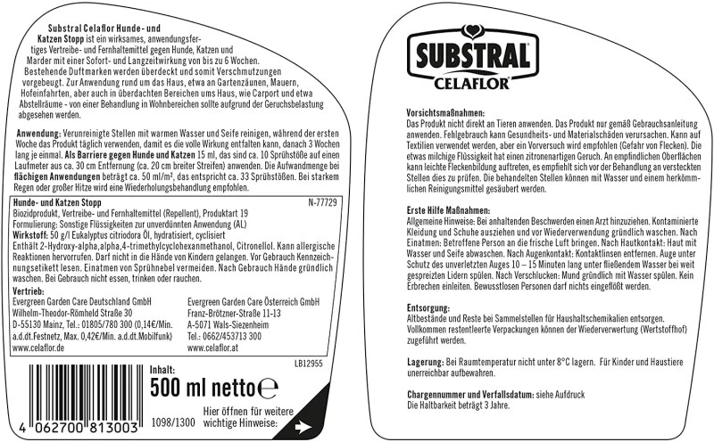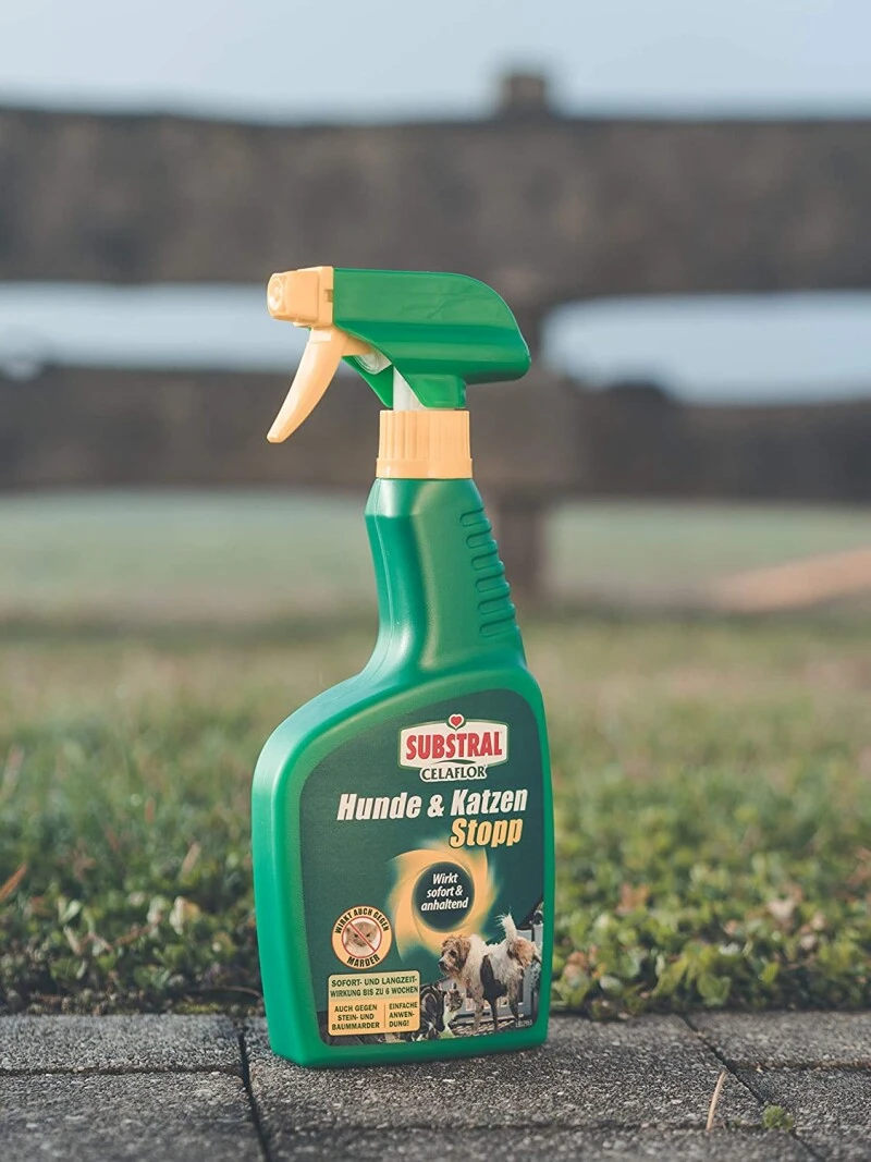 Substral Celaflor Hunde- und Katzen Stopp ist ein wirksames, anwendungsfertiges Vertreibe- und Fernhaltemittel gegen Hunde, Katzen und Marder mit einer Sofort- und Langzeitwirkung von bis zu 6 Wochen. Bestehende Duftmarken werden überdeckt und somit Verschmutzungen vorgebeugt. Zur Anwendung rund um das Haus, etwa an Gartenzäunen, Mauern, Hofeinfahrten, aber auch in überdachten Bereichen ums Haus, wie Carport und etwa Abstellräume – von einer Behandlung in Wohnbereichen sollte aufgrund der Geruchsbelastung abgesehen werden.