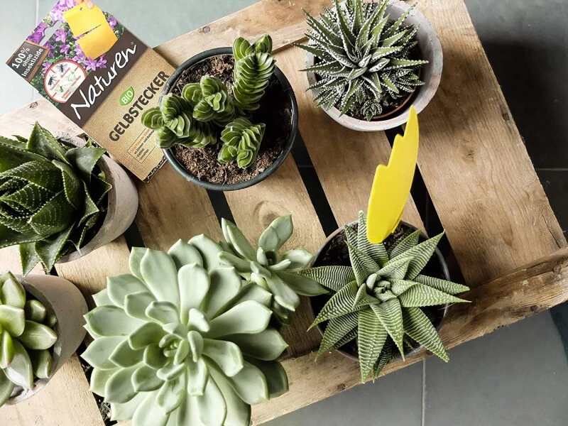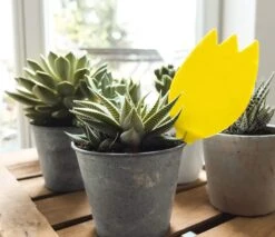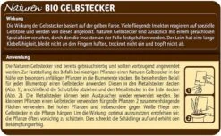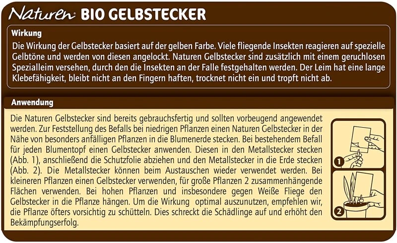 Naturen Gelbstecker locken die Schädlinge an und halten sie fest. Sie sind mit einem geruchlosen Spezialleim mit langer Klebefähigkeit versehen. Der Leim trocknet nicht ein und tropft nicht ab.