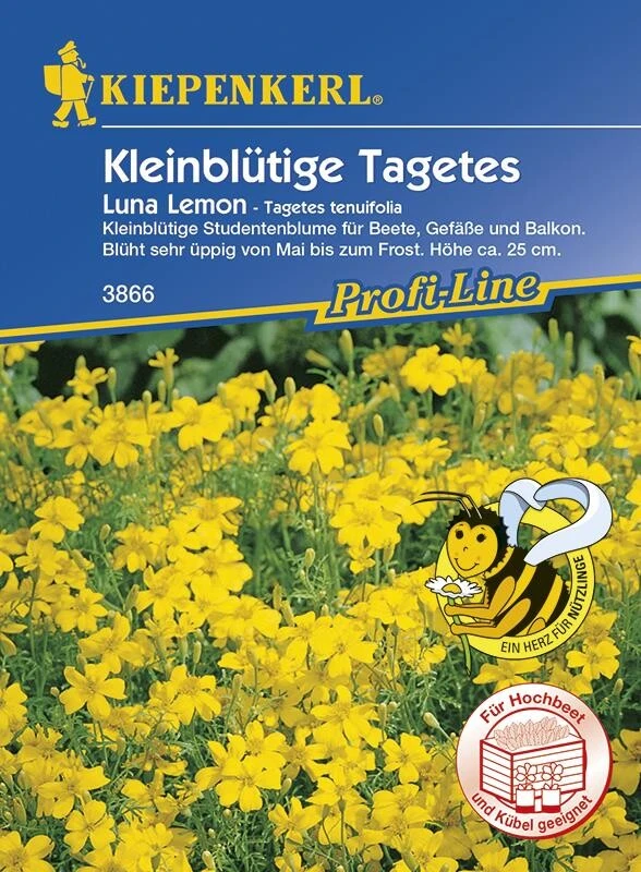 Sehr reich und ausdauernd blühende, kleinblütige Tagetes, deren zitronengelbe Blüten besonders intensiv leuchten. Die Pflanzen wachsen reich verzweigt und kugelig, bei flächiger Pflanzung als dichter Teppich.
