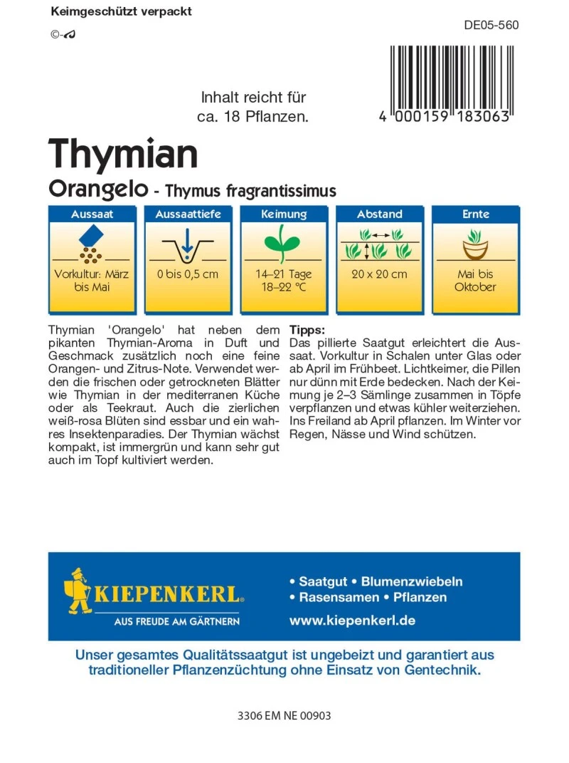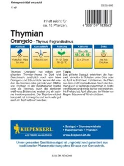 Der Thymian ‚Orangelo‘ ist eine mehrjährige Gewürzpflanze, die angenehm nach Orangen duftet. Sie wächst kompakt mit kleinen Blättern, ist immergrün und kann sehr gut auch im Topf ausgesäet werden. Im blühenden Stadium hat der Thymian einen hohen Zierwert und ist ein Insektenmagnet. Der pikante Thymian kann frisch und getrocknet zum Würzen verwendet werden.