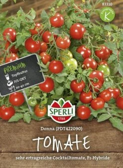 Die Tomate ‚Dona‘ ist eine sehr ertragreiche Cocktailtomate in Premiumqualität. Jede Pflanze trägt im Zeitraum von Juli bis Oktober im Schnitt mehr als 100 Früchte, wobei pro Traube bis zu 10 Früchte ausgebildet werden. ‚Dona‘ eignet sich ideal für die Topfkultur und wird, je nach Größe des Topfes, ca. 20 bis 40 cm hoch. In die Breite wächst sie bis zu 60 cm. Das oft notwendige Ausbrechen der Seitentriebe ist bei dieser sehr widerstandsfähigen F1-Hybriden nicht notwendig, was sie auch zu einer guten Ampelpflanze macht.
