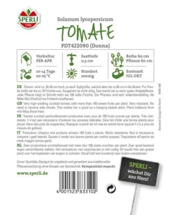 Die Tomate ‚Dona‘ ist eine sehr ertragreiche Cocktailtomate in Premiumqualität. Jede Pflanze trägt im Zeitraum von Juli bis Oktober im Schnitt mehr als 100 Früchte, wobei pro Traube bis zu 10 Früchte ausgebildet werden. ‚Dona‘ eignet sich ideal für die Topfkultur und wird, je nach Größe des Topfes, ca. 20 bis 40 cm hoch. In die Breite wächst sie bis zu 60 cm. Das oft notwendige Ausbrechen der Seitentriebe ist bei dieser sehr widerstandsfähigen F1-Hybriden nicht notwendig, was sie auch zu einer guten Ampelpflanze macht.