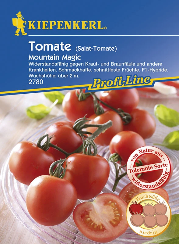 Die glänzend roten Früchte der Cocktail-Tomate ‚Mountain Magic, F1‘ sind rund, circa 5 cm groß und 50 g bis 70 g schwer. Im Geschmack sind die schnittfesten Tomaten aromatisch mit einer angenehmen, milden Säure, denn sie haben nur eine niedrige Fruchtsüße. Damit eignen sie sich bestens für die Zubereitung von Salaten. Die schmackhaften Tomaten können von Juli an und bis in den Oktober hinein geerntet werden. Diese F1-Hybride ist sehr widerstandsfähig, so beispielsweise gegen die Kraut- und Braunfäule, Verticillium-Welke und Fusarium-Welke. Die robusten Pflanzen werden über 2 m hoch und gedeihen am besten an einem warmen und sonnigen sowie windgeschützten Platz.