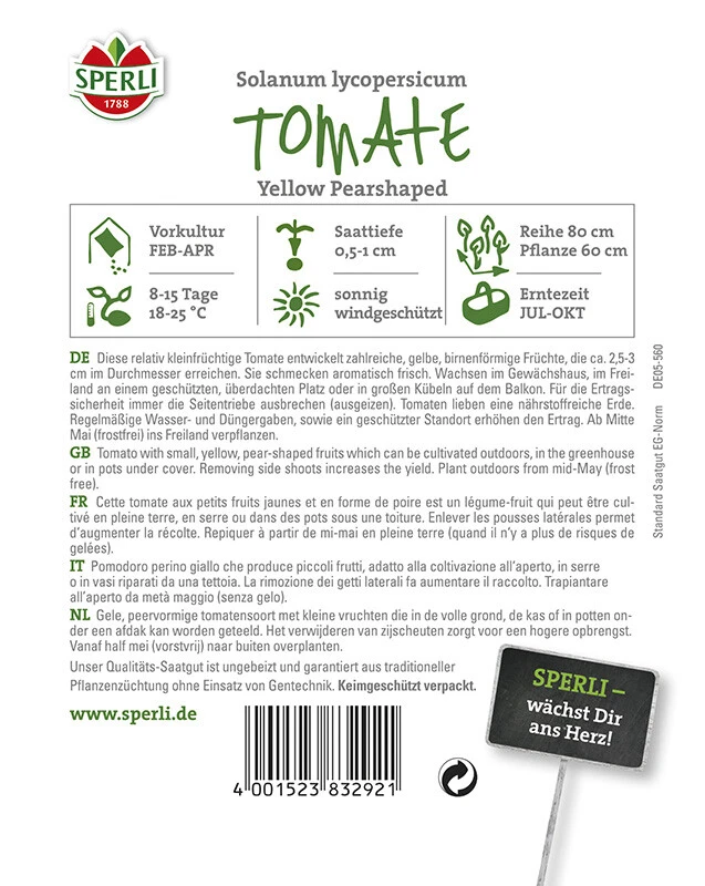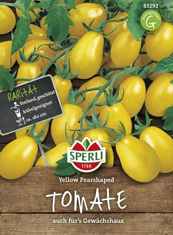Die Tomate ‚Yellow Pearshaped‘ ist eine über 200 Jahre alte Traditionssorte und mit ihren kleinen, gelben, birnenförmigen Früchten zugleich auch eine Rarität. Geschmacklich überzeugt sie auf ganzer Linie mit einem intensiven Aroma. ‚Yellow Pearshaped‘ kann im Gewächshaus oder an einem geschützten, bestenfalls überdachten Platz im Freiland kultiviert werden. Auch in großen Kübeln ist ein Anbau möglich. Die Reife setzt mittelfrüh ein und hält bis zum ersten Frost im Oktober an.