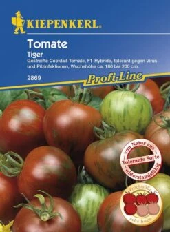 Die rot-grün gestreifte Cocktail-Tomate ‚Tiger, F1‘ ist eine widerstandsfähige Sorte, die sich tolerant gegen Virus- und Pilzinfektionen wie Fusiarium- und Verticilium-Welke und gegen das Tomatenmosaik-Virus zeigt. Sie erreicht eine Wuchshöhe von ca. 180 bis 200 cm und bringt im Rahmen der Ernte Cocktail-Tomaten mit einem Fruchtgewicht von 40-50 g hervor. Die von Juli bis Oktober zur Ernte bereiten Früchte haben eine sehr hohe Fruchtsüße und sind daher auch bei Kindern stets beliebt. Die Früchte überzeugen durch eine gute Haltbarkeit.