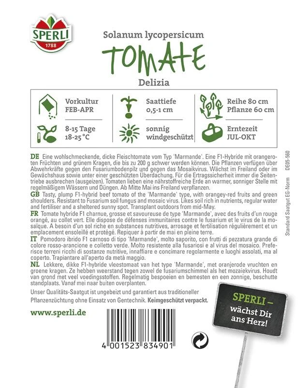 Die Tomate ‚Delizia‘ ist eine wohlschmeckende Fleischtomate mit dicken, ca. 200 g schweren Früchten. Ihre Schale und ihr Fruchtfleisch sind orangerot gefärbt. Die F1-Hybride vom Typ „Marmande“ lässt sich im Freiland und im Gewächshaus oder unter geschützten Überdachungen gut kultivieren. Entscheidend für einen erfolgreichen Anbau sind ein sonniger Standort, nährstoffreiche Erde und regelmäßiges Gießen und Düngen. ‚Delizia‘ verfügt über gute Abwehrkräfte gegen den Fusariumbodenpilz und das Tomatenmosaikvirus.