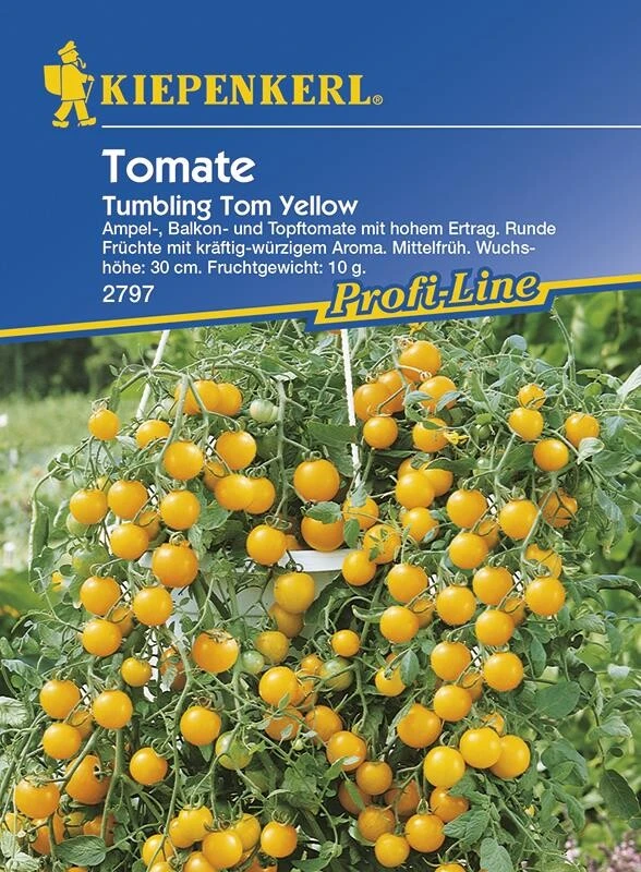 Die Cherry-Tomate ‚Tumbling Tom Yellow‘ aus dem Kiepenkerl Profi-Line-Programm ist die Schwester von ‚Tumbling Tom Red‘, allerdings mit runden, leuchtend gelben Früchten. Diese überzeugen mit einem kräftig-würzigen Aroma und haben genau die richtige Größe zum Naschen, können aber auch wie dekorative Cocktailtomaten aufgeschnitten oder für Salate und Suppen und im Aufschnitt verwendet werden. ‚Tumbling Tom Yellow‘ passt mit ihrem überhängenden, buschigen Wuchs perfekt in größere Ampeln, in Hochbeete, Gefäße und Balkonkästen.