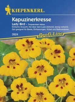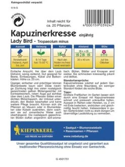 Einfache Anzucht, frei über dem Laub blühend, wenig rankend. Gut geeignet für Beete. Einfassungen, Kübel und Balkonkästen. Die Pflanzen halten Raupen, Läuse und andere Schädlinge von Nutzpflanzen fern und sind deshalb ein geschätzter Pflanzpartner in der Mischkultur. Größere Frei flächen im Garten lassen sich durch eine Einsaat mit Kapuzinerkresse schnell und preiswert unkrautfrei halten.