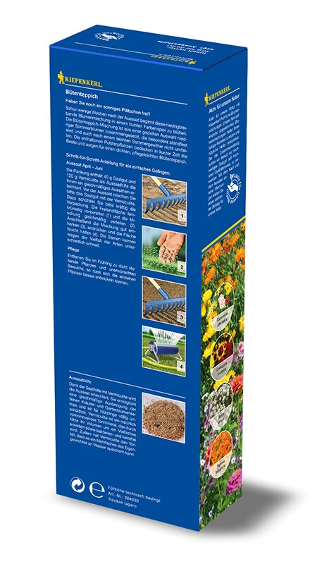 Die Blumenmischung „Blütenteppich“ enthält pflegeleichte Dauerblüher, die den Garten in einen bunten Blütenteppich verwandeln. Schon wenige Wochen nach der Aussaat beginnt diese einjährige Blumenmischung aus dem Kiepenkerl Profi-Line-Sortiment in einem bunten Farbenspiel zu blühen. Sie ist aus einer gezielten Auswahl niedriger Sommerblumen zusammengesetzt, die besonders standfest sind und auch nach einem leichten Sommergewitter nicht umknicken. Die enthaltenen Polsterpflanzen bedecken in kurzer Zeit die Beete und sorgen für einen dichten, pflegeleichten Blütenteppich.