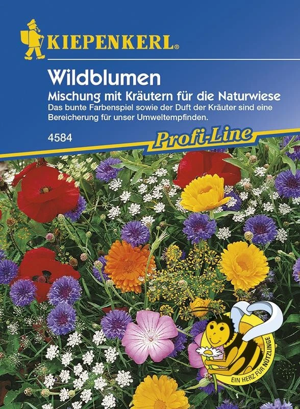 Die Blumenmischung „Wildblumen mit Kräutern“ aus dem Profi-Line-Programm von Kiepenkerl bietet ein buntes Farbenspiel und den herrlichen Duft von Wildblumen und Kräutern. Die Pflanzen sind eine Bereicherung für unser Umweltempfinden und bieten vielen nützlichen Insekten passend dazu ein reichhaltiges Nektar- und Pollenangebot. Mit Grassamen vermischt eignet sich diese ein- und mehrjährige Mischung sogar für Rasenflächen. Bei einer Aussaat im April zeigen sich schon im ersten Jahr viele schöne Blüten. Der typische Kräuterflor entsteht im zweiten Jahr, wenn die einjährigen Pflanzen gewichen sind.