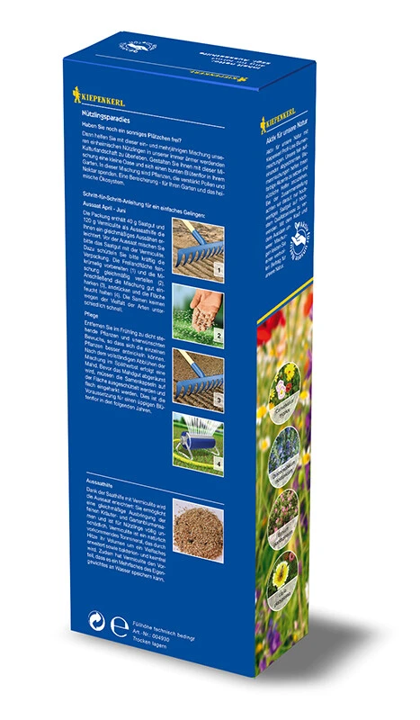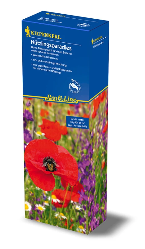 Mit der Blumenmischung „Nützlingsparadies“ können Sie ein kontrastreiches Blütenparadies mit reichlich Nektar und Pollen als Nahrungsgrundlage für Hummeln, Bienen, Schmetterlinge und andere Nützlinge erschaffen. Auf diese Weise leisten Sie einen wertvollen Beitrag für ein intaktes Ökosystem und zaubern nicht zuletzt noch einen wunderschönen Blütenflor in Ihren Garten. Diese Mischung aus dem Kiepenkerl Profi-Line-Programm enthält Sommerblumen, die verstärkt Pollen und Nektar spenden. Sie fühlen sich an einem sonnigen Standort wohl und blühen von Juni bis Oktober.